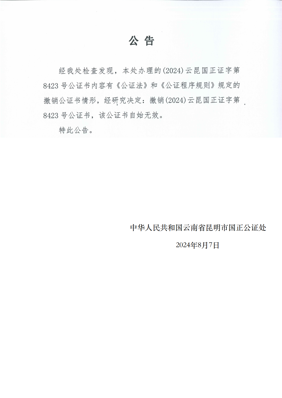 关于撤销(2024) 云昆国正证字第8423号公证书的公告