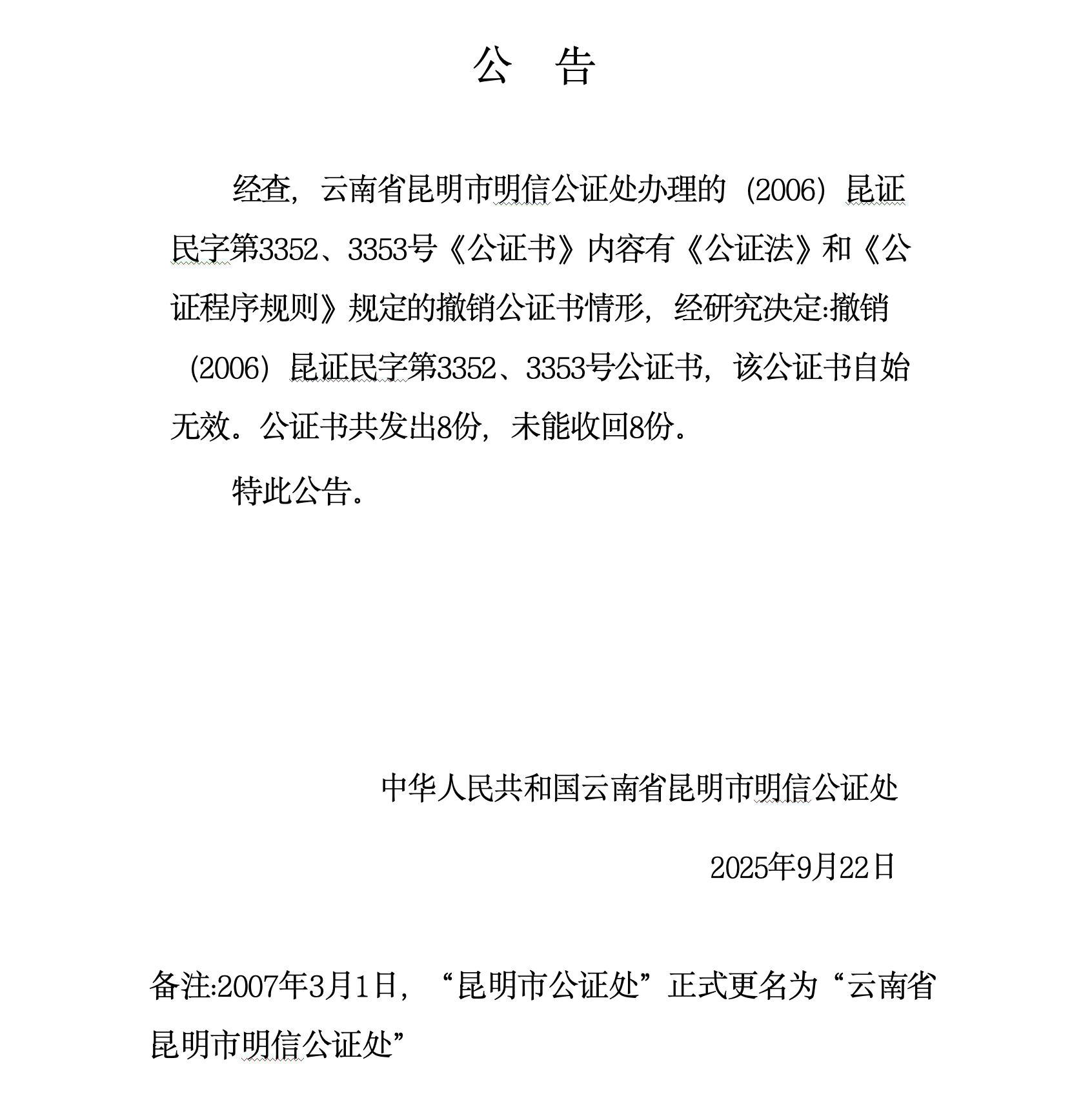关于撤销(2006)昆证民字第3352、3353号公证书的公告